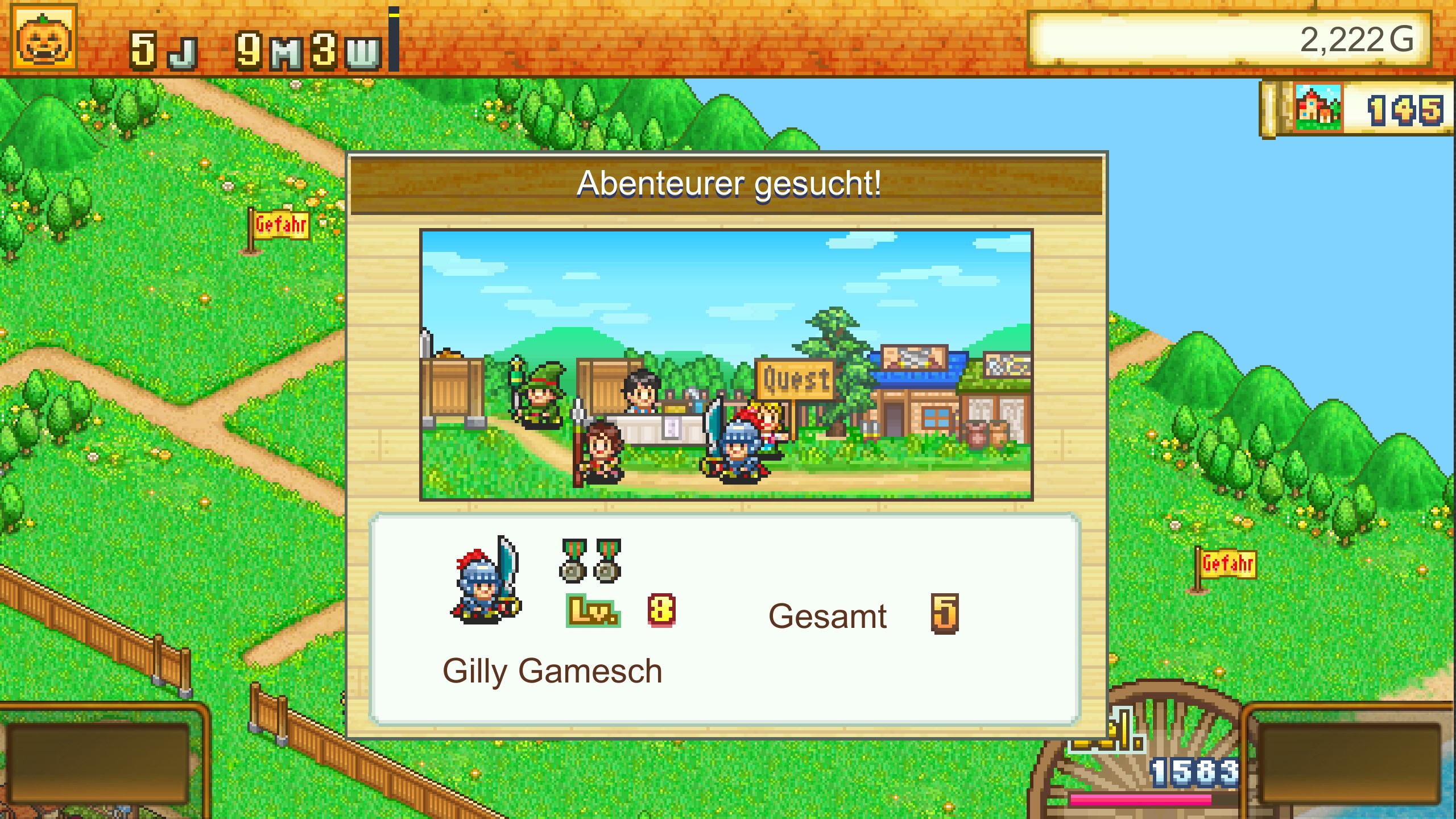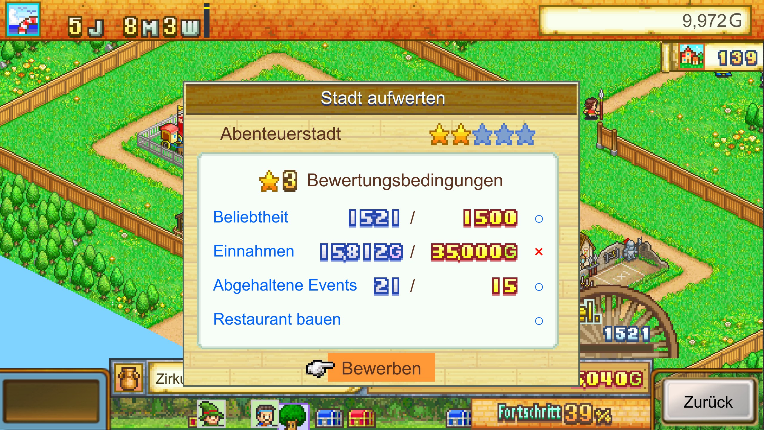 Diese Stadtpunkte bekommt man anhand der Anzahl der besiegten Monster im letzten Monat. Neue Gegenstände für den Verkauf erhält man ebenfalls durch Quests oder durch Pumpkins Shop. Hat ein Abenteurer die Stadt lieb gewonnen, will er ein eigenes Haus in der Stadt. So bekommt man ebenfalls als Dank neue Gebäude oder Gegenstände, daneben zahlen sie abhängig von ihren besiegten Monstern Steuern. Das Spiel kann nicht frei gespeichert werden, es gibt nur einen Speicherslot pro Stadt. Da man aber nichts falsch machen kann, ist das kein Problem. Wenn ein Abenteuer Level 10 erreicht kann man seinen Beruf wechseln und er bekommt zusätzliche Bonus-Attribute vom alten Beruf. Die Berufe sind so etwas wie Magier, Ritter, etc., diese liefern nach der Meisterung auch zusätzliche Vorteile wie höhere Preise bestimmter Gebäude. Auch die Gebäude steigen irgendwann im Level auf und steigern so ihre Anziehungskraft und Preise. Ziel des Spiels ist es die Stadt auf Level 5 zu bekommen, dafür benötigt man ca. 10 Stunden.
